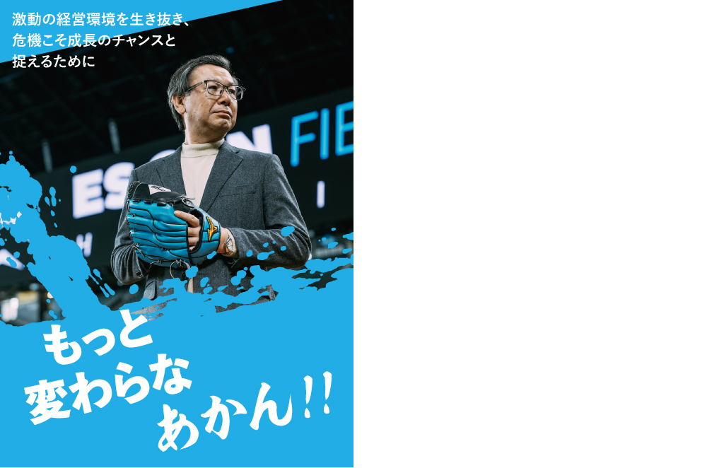 実績数値をベースに単年のPLを意識するだけでなく、「あるべき姿」からバックキャスト思考で考え、非連続の成長に向けた「挑戦」をしていく必要があります。現場への挑戦意欲の浸透に向けて、私は1年間現場を巡り、さまざまな方と議論しました。2024年度は、「変えてもええで。」というスローガンをつくり、リアルでの対話とイントラネット等での啓発活動を展開しましたが、挑戦する姿勢が見受けられるようになってきたと思う一方で、「挑戦」する意識が自分ゴトとして現場に浸透していないと感じることもあります。今期は一歩進んで、「もっと変わらなあかん‼」にスローガンを変更しました。激変する外部環境に対応できる強靭な企業体への変革ができれば、飛躍的な成長が可能です。