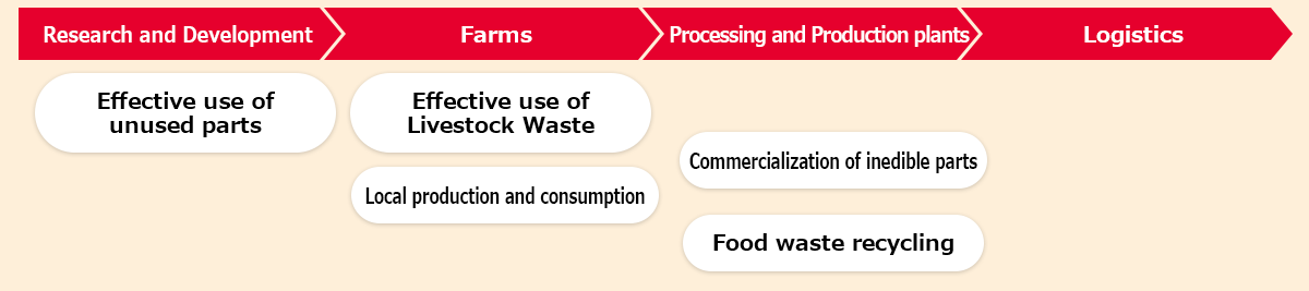 ニッポンハムグループは、豚、鶏、牛の処理工場で発生する食用とならない副産物(不可食部位)は、飼料、肥料、燃料、工業原料に加工し、有効活用しています。