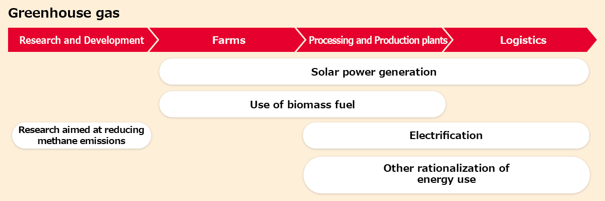 燃料転換や廃熱回収、高効率機器への更新、および機器の運転管理の見直しなどの取り組みを行っています。日本デイリーネット(株)では、積載効率や輸送ルートの見直しを行い、ニッポンハムグループ内の製造工場と各物流センターの輸送効率の向上に取り組んでいます。