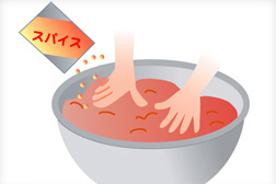 ミンチ肉にオリジナルスパイスを加えて、しっかりとこねます。