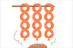 注)輪が1つできたら、片方の端を輪の中に通し、ほどけないようにします。 - この作業を繰り返していき最後の部分は3回固結びをします。