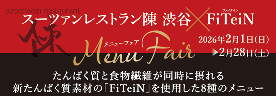 日本ハム株式会社(本社:大阪市北区、代表取締役社長:井川 伸久)は、本格四川料理で有名な「スーツァンレストラン陳 渋谷」において、大豆をベースに開発した新たんぱく質素材「FiTeiN(ファイテイン)」による8種類のメニューを2月1日(日)から2月28日(土)の期間限定で提供します。FiTeiNは、たんぱく質と食物繊維が同時に摂れ、脂質が少ないことから、フェアを通して、さっぱりと中華料理を味わいたい健康志向の方に訴求していきます。