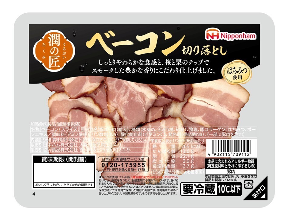 豚ばら肉(輸入)、糖類(水あめ、ぶどう糖、砂糖)、食塩、豚コラーゲン、はちみつ、ポークエキス/調味料(アミノ酸等)、リン酸塩(Na)、酸化防止剤(ビタミンC)、発色剤(亜硝酸Na)、(一部に豚肉を含む) |