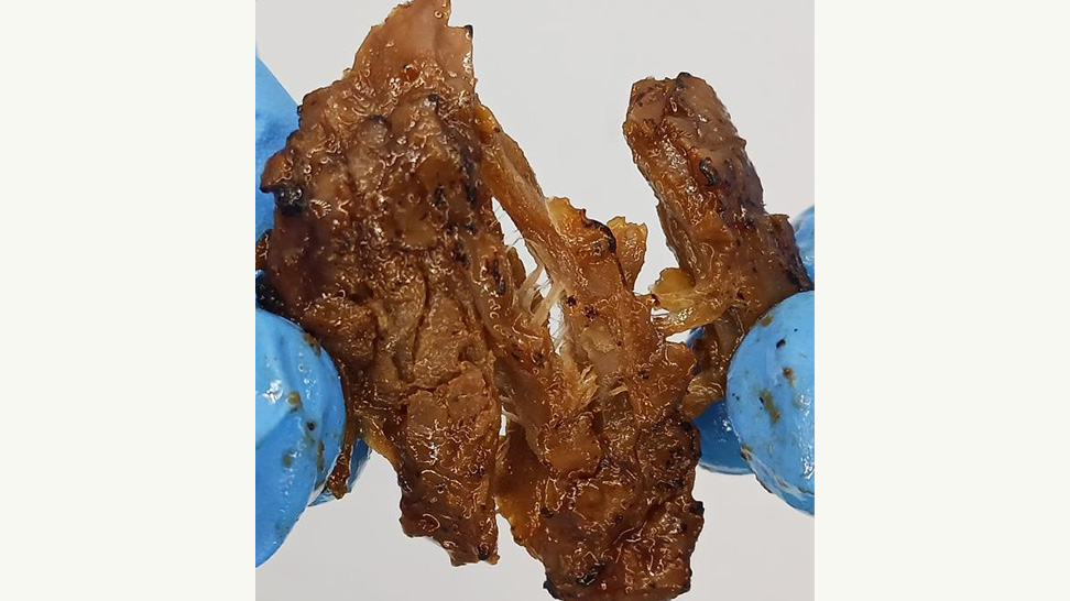 「試行錯誤の結果、初めて納得がいくものができた時には、見た目も段違いで感動しました。それまでの試作品は表面がツルツルだったのに対し、繊維っぽい凹凸のある表面になっていたのです。繊維感があっても、一方向だけに裂けるようでは鶏肉の食感になってしまいます。しかしできあがったものは、想定した通り、繊維様のかたまりがランダムに並び、弾力はあるのに食べるとほぐれ感もあるという、牛肉らしい食感になりました」(飯田)。