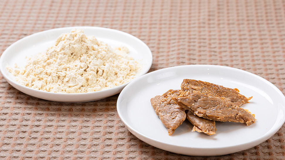 原料の大豆粉(左)と、できあがったFiTeiN(右)。