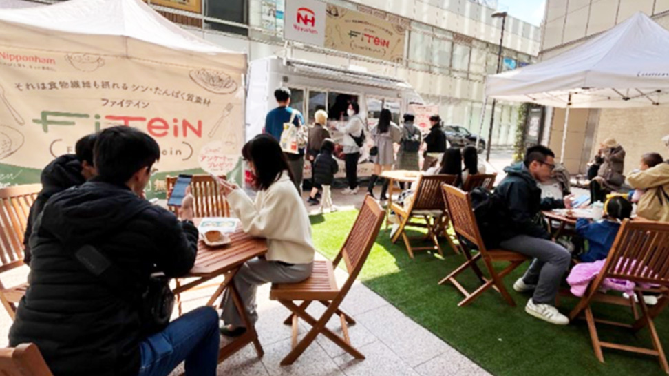 一方、国内でも有楽町で行った試食アンケート調査でも好評を得、「お肉らしさを実感した」という人が94%に上った。FiTeiNを食べる際の理由では、「食物繊維とたんぱく質が摂取できるから」と回答した人が38%、「肉より高たんぱく」(19%)、「肉感を感じられる」(10%)と続いた。また、シニア層の参加者からは、「肉や揚げ物は胃がもたれるが、脂質が低いと胃の負担も軽く、罪悪感なく食べられる」という声もあった。