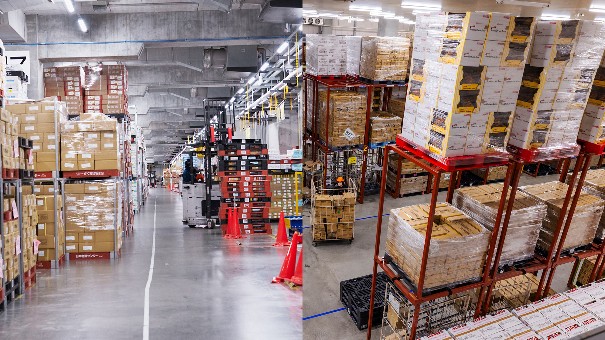 右の加工食品の倉庫は、商品の取り出しやすさが重要になるため空間がゆったりとしている