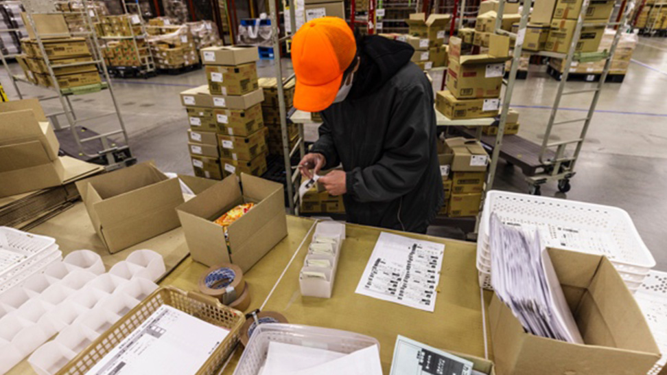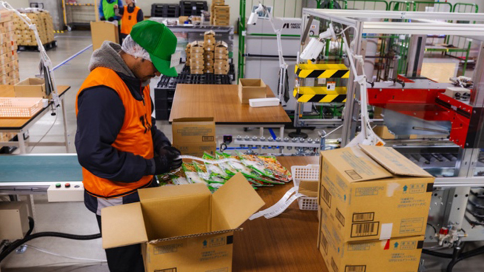 そしてもう1つは「複数の商品を店舗ごとに1つの箱に詰め替えて発送するなど、小売店の多様な要望に合わせた “仕分け”作業」です。これら仕分け作業は、一部は機械化されているものの、小売店からの要求が多岐にわたるため、基本的には人の手で行うことになります。10℃以下で温度管理された巨大な低温倉庫の中で行われる大変な作業となるのです。
