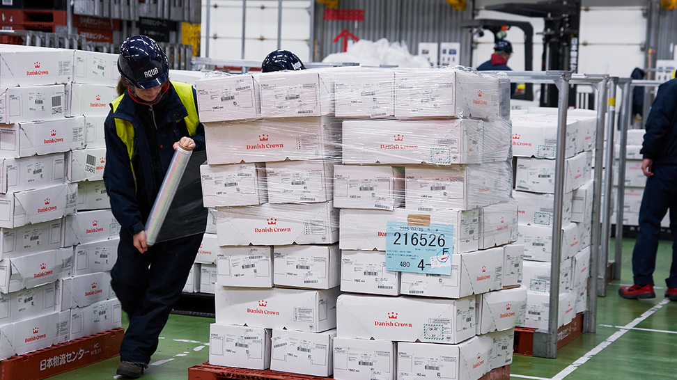 まず食肉事業を見てみましょう。国内のグループ農場で生産、処理・加工された牛・豚・鶏肉、また海外のグループ会社等から輸入された食肉などは、主に東日本エリアの川崎市、西日本エリアの西宮市、大阪市の3つの拠点にある「日本物流センター」に集約して保管されます。