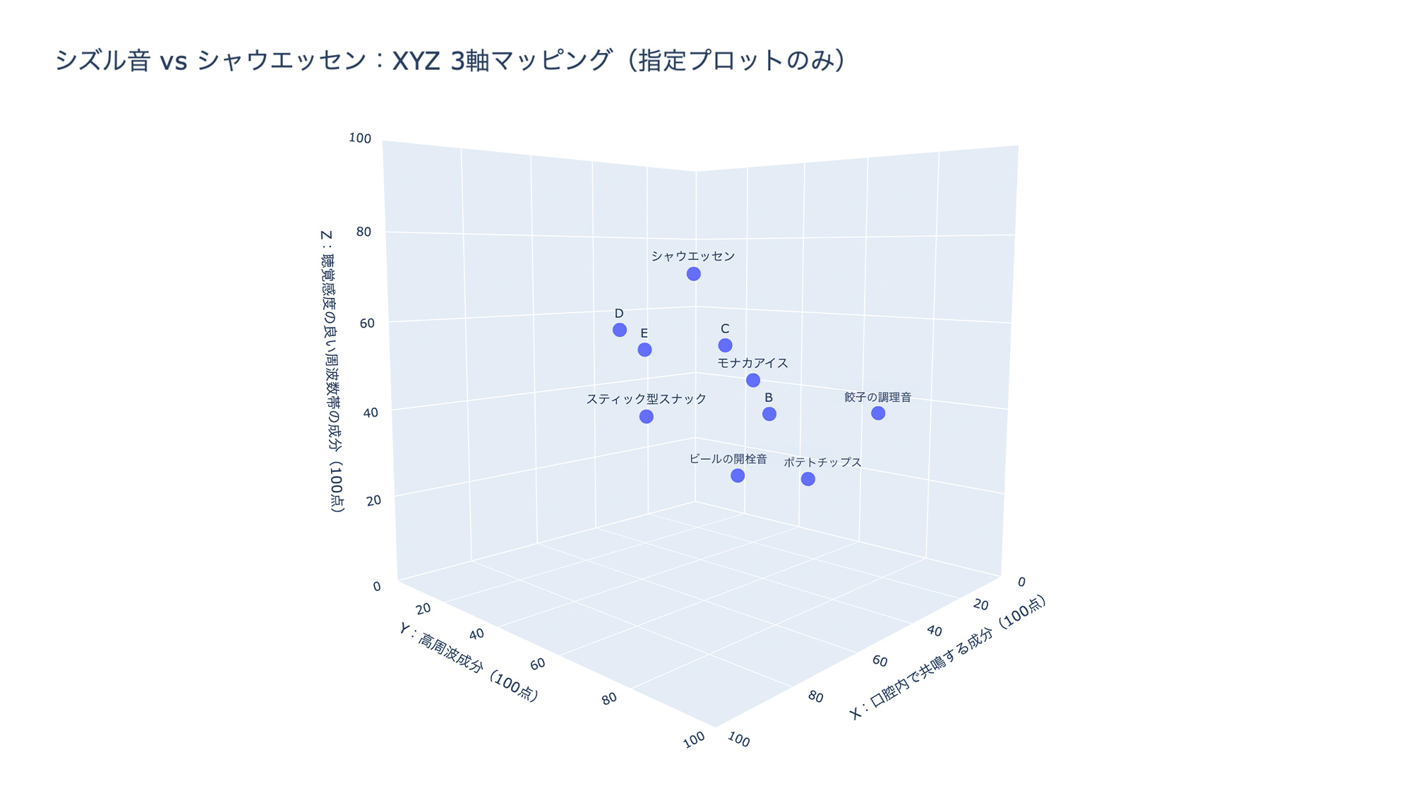 高周波成分(1万Hz以上)はキレの良さや爽やかさを、聴覚感度の良い周波数帯(2000~5000Hz)はしっかりとした歯ごたえを、口腔内共鳴(約1000Hz)は「食べている」という実感を与えます。