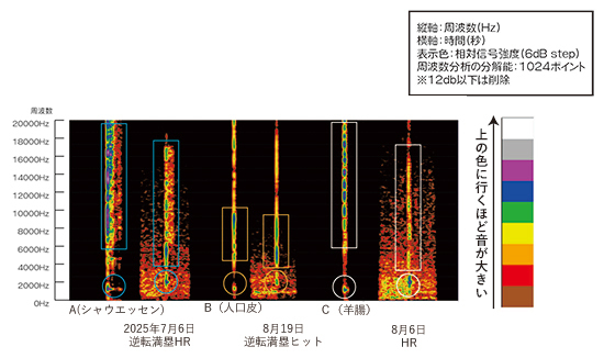 また、日本音響研究所が保有する過去のさまざまな音データと比較した結果、音の構造が野球のホームラン音に類似するとの面白い特徴も判明しました。